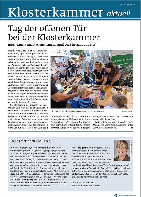 Seit Mitte September hat die Klosterkammer mit Dr. Thela Wernstedt eine neue Präsidentin, lesen Sie mehr dazu sowie zum Tag der offenen Tür auf der Titelseite. Erfahren Sie auf den Seiten 2 und 3, warum die Klosterkammer in die Pflegefachschule in Wolfenbüttel investiert hat, sowie auf den Seiten 4 und 5 Interessantes über Skulpturen-Restaurierungen vor der Heilig-Kreuz-Kirche in Hildesheim. Weitere Themen sind geförderte soziale Stadtführungen (Seite 6), das Jubiläum der Klosterforsten (Seite 7) und das Klostergut Lamspringe auf Seite 8.