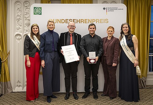 Ministerialdirektorin Christel Jagst (2.v.r.) überreichte gemeinsam mit Freya von Czettritz (2.v.l.), CEO DLG Holding, im Beisein von Destillatkönigin Anna Steinmann (l.) und Destillatprinzessin Denise Meyer (r.) Urkunde und Medaille an Geschäftsführer Robert Reznizak (3.v.l.) und Destillateurmeister Dany Mailah (4.v.l.). Foto: DLG/ Anne Orthen