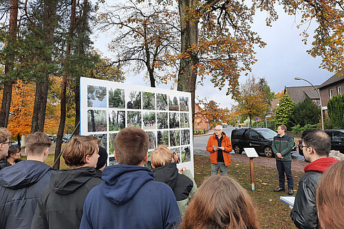 Projektleiter Uwe Stelter erläuterte zur Eröffnung am 28. Oktober 2025 das Konzept des Foto-Workshops, den die Klosterkammer Hannover seit 2013 innerhalb Niedersachsens ausrichtet. Mit dabei waren Klosterforsten-Revierleiter Philip Kruse, der die Gruppe Ende September 2025 durch das Revier Luhetal geführt hat, sowie Schülerinnen und Schüler der Klasse 9c, die teilgenommen haben. Als Vertreter der Schulleitung war Markus Bewernick vor Ort, aus der Fachschaft Kunst Lucy Buhr sowie die Klassenlehrerin Corinna Meyer.