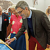 Dr. Stephan Lüttich (r.) testet die interaktive Medienstation, an der man an einem Touch-Bildschirm ausprobieren kann, wie sich Bereiche des Altars reinigen und vergolden lassen. Foto: Lina Hatscher, Klosterkammer