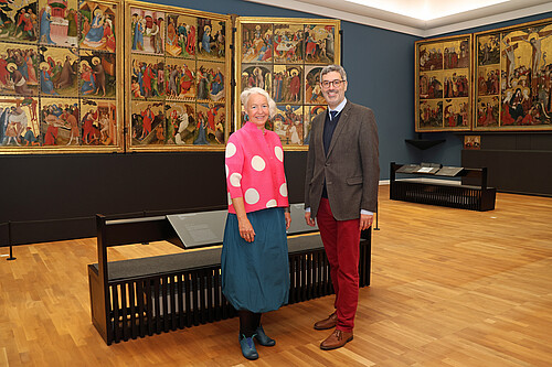 Museumsdirektorin Prof. Dr. Katja Lembke (l.) und Dr. Stephan Lüttich, Klosterkammer-Abteilungsleiter Förderungen, im Ausstellungsraum der Goldenen Tafel. Foto: Lina Hatscher, Klosterkammer