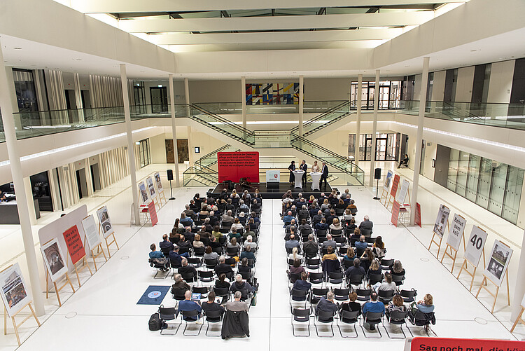Zunächst sprach Landtagspräsidentin Hanna Naber zur Eröffnung und begrüßte die rund 150 Gäste in der Portikushalle des Landtags. Sie sagte: „Denkmalpflege gibt der Zeit ein Gedächtnis. Sie bewahrt, was uns geprägt hat – Häuser, Plätze, Spuren –, und erinnert uns daran, dass unsere Gegenwart Wurzeln hat.“