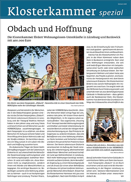 In „Klosterkammer spezial“ stellen wir zwei Förderungen zur Schaffung von Wohnraum für Menschen ohne Obdach in Lüneburg und Bardowick vor. Die Klosterkammer hat entsprechende Projekte der Lebensraum Diakonie mit insgesamt 400.000 Euro unterstützt.